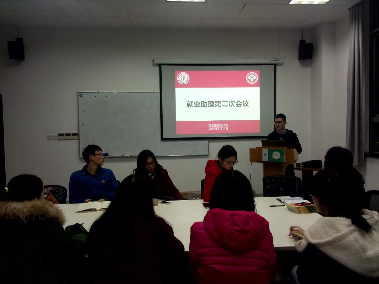 3月14日晚20点30分,在共享空间302房间,就业推进办公室召开了就业助理第二次会议。就业推进办公室雷妍老师、12级就业大组长肖宇学长以及13位就业助理参与了会议。主要就值班安排说明、就业工具包的使用和后期工作布置做了介绍。
