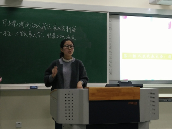 接下来授课的是第六组的刘晓梅同学,她为我们带来的是《人民代表大会制度》的教学内容。晓梅同学精心准备了这次授课,她首先引出两会的时政热点,接着回顾了以往的学习内容,并与今天的教学内容相结合,引导同学们养成串联前后知识点的好习惯。逻辑清晰严密的板书,富有感染力的讲解,晓梅同学顺利完成教学目标。