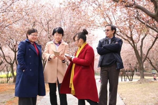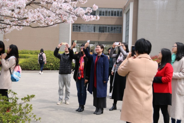 生物专业出身的苏振兴老师热情地为大家科普樱花的相关知识,比如花期、品种等等,小伙伴们听的津津有味。由于当天的天气特别好,来赏樱的学生也是越来越多,吴老师提议,书院的老师们一起拍张合照,一张照片一份记忆,留藏的不是樱花,而是青葱的岁月。