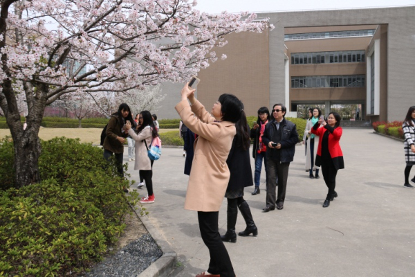 大家一路谈笑风生,心情十分愉悦。樱花树边,老师们纷纷掏出手机拍下它最动人的一瞬,三三两两的与樱花合照。年轻的女教师们貌似都要挣个人比花娇,这些平日里忙碌的老师们也有这么可爱的一面。