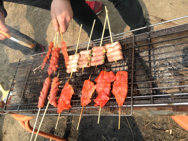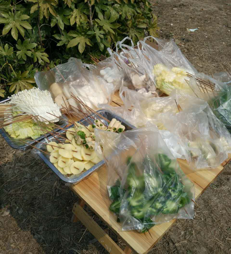 由于缺乏经验,再加上木炭不太好燃,生火这件事可是费了一大番周折。然而不经历磨难,又怎么能吃到美味的食物呢?把火生着可是最关键的一步。大家又尝试用易燃的竹竿枯草引燃,并且在侧面轻轻吹着小火苗,终于,火燃起来了!大家都感到十分激动,毕竟这是靠自己的努力完成的,更重要的是,火烧起来的时候,大家饿了已久的肚子似乎突然得到了安慰~
