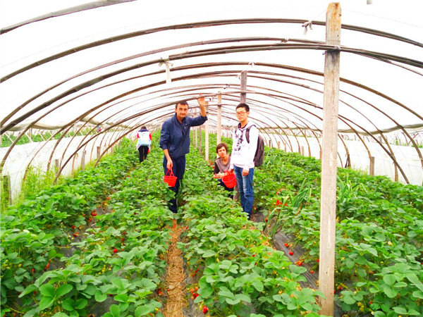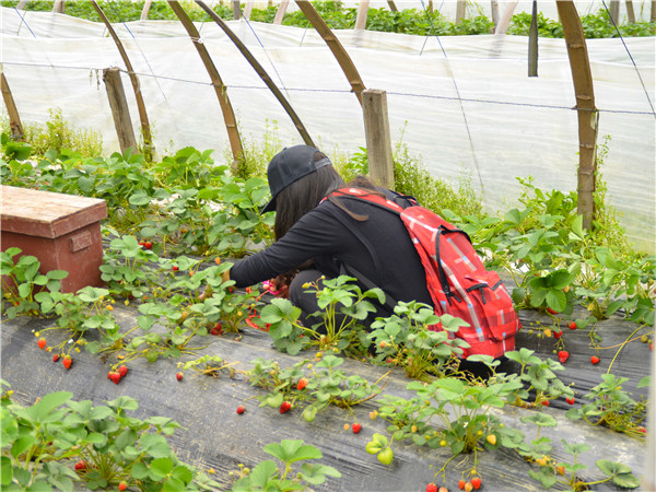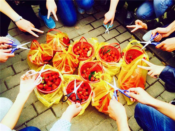 棚里温度很高,同学们不一会就忙的满头大汗。走出去吹吹风,闻闻空气中酝酿着的草莓芬芳,看看路边来来往往的行人,随手采几朵随风摇曳的油菜花,点缀在盛满草莓的篮子上,或挑出一个大个的草莓擦一擦,偷偷咬下一口。这样充满田园气息的小资小调的午后,真是不可多得的美好时光。同学们都很喜欢这次草莓园活动,一位同学说:“这次活动规模虽小,可是我们可以‘以小见大’,体验自然,感受到了田园生活的惬意!”