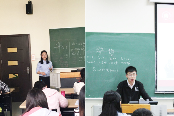 数学专场的学姐学长同样带来了精彩的授课。戚艳兴学姐带来了精心准备的面向大学生的一堂正弦定理课。她讲了正弦定理最初的多种不同证法,拓宽了大家的思路,又讲了正弦定理的魅力,激发大家对数学这一学科的热爱,之后则请同学们出关于正弦定理的题目,加深大家的理解。各个环节相扣,带给同学们不一样的数学感受。随后上场的郑晓龙学长以一个问题引出今天的授课主题——数学归纳法,并运用多米诺骨牌的形象比喻,使听课同学们既易于理解,又能加深印象。短短的两个小时里,大家都受益良多。数学专场的学姐学长同样带来了精彩的授课。戚艳兴学姐带来了精心准备的面向大学生的一堂正弦定理课。她讲了正弦定理最初的多种不同证法,拓宽了大家的思路,又讲了正弦定理的魅力,激发大家对数学这一学科的热爱,之后则请同学们出关于正弦定理的题目,加深大家的理解。各个环节相扣,带给同学们不一样的数学感受。随后上场的郑晓龙学长以一个问题引出今天的授课主题——数学归纳法,并运用多米诺骨牌的形象比喻,使听课同学们既易于理解,又能加深印象。短短的两个小时里,大家都受益良多。