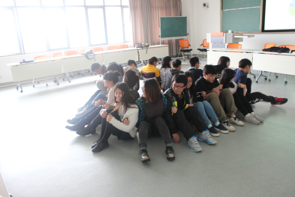 接下来体育系的王伟同学以“破冰”为主题,开展了“串名字”、“快乐大转盘”、“坐地起身”三个游戏。在破冰游戏中,同学们逐渐熟悉后建立了团队友谊。在最后一个游戏中,大家互相帮助,成功完成主持人给出的挑战。