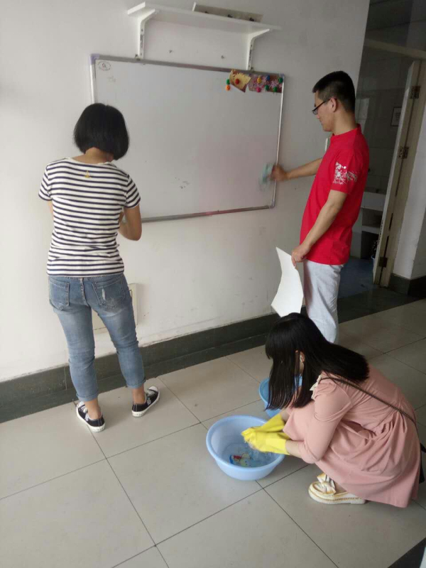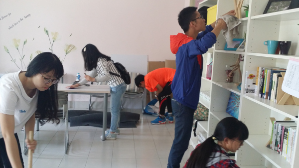 为方便大家的学习生活,每栋宿舍楼里都会有一个活动室,但平时由于疏于整理,活动室有些凌乱,5月3日中午,第一和第七小分队共同清扫了这些活动室,将桌椅摆放整齐,并将书架和其他摆设擦拭干净,让同学们能够更好地在活动室谈论、学习。