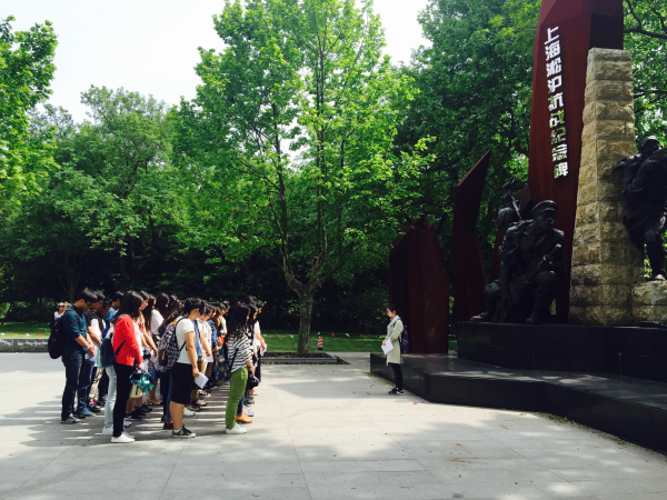 在前往淞沪纪念馆的车上,书院党建工作中心的工作人员向参与学生党员和入党积极分子简要介绍淞沪抗战的历史背景、战争经过和历史意义,启发同学们在参观的过程中紧密联系学校学习工作和成长历程,激发个人真善美的品质,锤炼高尚品格,落实学生党员和入党积极分子的示范效应。淞沪抗战纪念广场庄严肃穆,到达后,学生党员和入党积极分子首先在广场的淞沪抗战纪念碑下向革命先烈致敬。全体师生肃立,向在中国人民抗日战争中牺牲的英烈默哀。庄严的默哀后,集体朗诵了淞沪抗战英烈朱耀章将军的诗篇《月夜巡视阵线有感》。“…为自由,争生存,沪上麾兵抗强权。踏尽河边草,洒遍英雄泪,又何必气短情长?宁碎头颅,还我河山!”场上寂静唯诵读声声,师生们仿佛回到了当年肃杀的场景,体会着战士们质朴的爱国情怀。