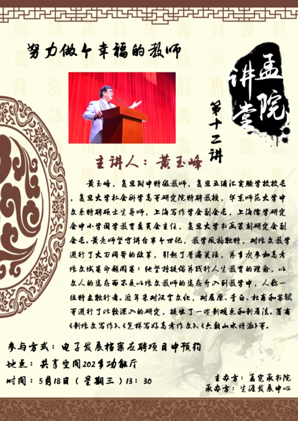 黄玉峰,复旦附中特级教师,复旦五浦汇实验学校校长,华东师范大学中文系特聘硕士生导师,教学风格独特,人称一位特立独行者。著有《育人之道》、《教学生活得像个人》等。如今,这位“独行者”将空降孟院讲堂,诠释不一样的幸福教师。敬请关注本期孟院讲堂——努力做个幸福的教师。
