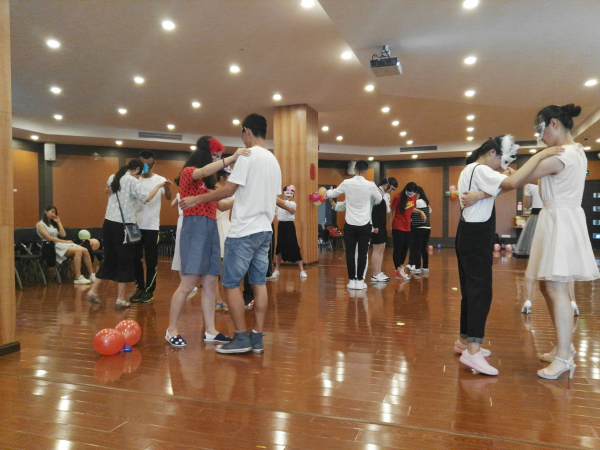 帅男靓女的面具,搭档组合,一个小小的踩气球游戏令彼此磨合出了默契。特邀嘉宾带来了一支唯美的华尔兹舞蹈,令人陶醉的舞姿让在场的所有人都迫不及待地想要学习。掌握了一些基本的舞步后,伴随着富有节奏感的旋律,男士们带着自己的女伴翩翩起舞。