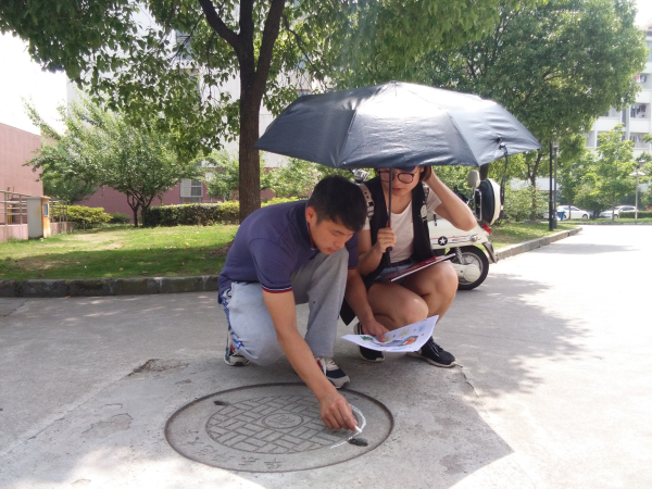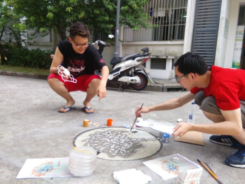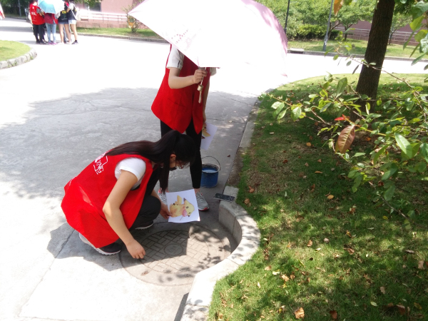 终于,重头戏来啦!5月25日下午13:00,井盖涂鸦活动正式开始!活动的协办方美术教育专业的同学们带上了满满当当的涂鸦所需的工具和颜料来到了集合地点。志愿者们也纷纷分好小组,化身成为最佳助手,一边为拿着粉笔认真打底稿的美术教育专业的同学打伞,一边蓄势待发准备战斗!