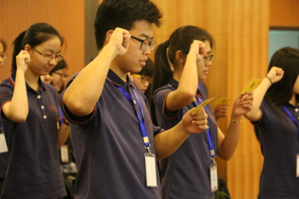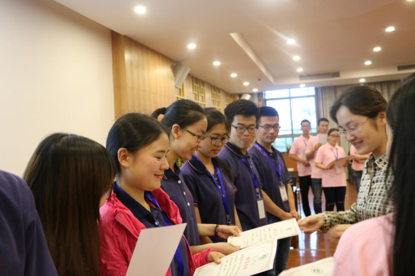 营会最后环节,由15级生科专业学导代表陆妍瑾上台带领全体学导进行宣誓。学导将一天的体验感受化作字字誓言,表达自己对于学导工作的热诚与对于新生关怀的坚持。宣誓结束,各位嘉宾老师向学导们颁发结营证书,祝贺学导们顺利完成营会培训和项目策划。