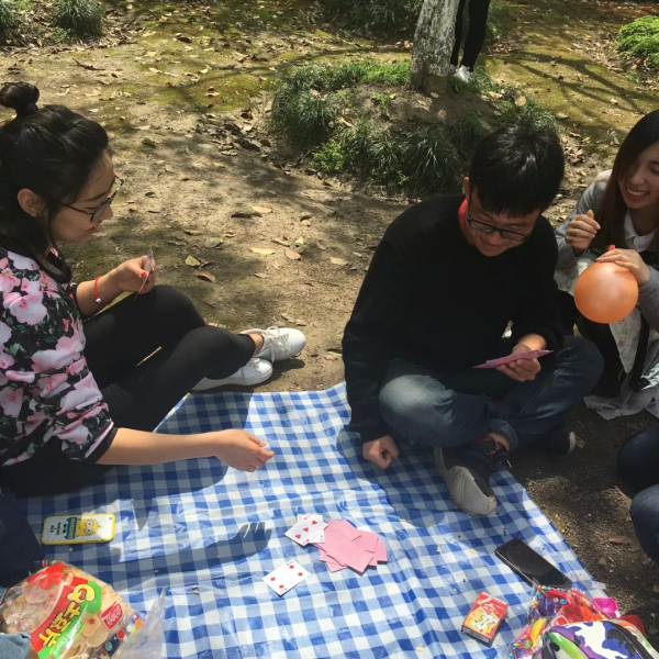 到达目的地后,同学们极有默契地布置活动场地,而活动的组织者们也贴心地为同学们提前准备了零食和小吃。于是,同学们沐浴于春光下,边吃边聊,好不痛快!
