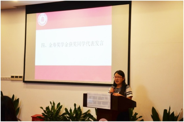 在颁奖仪式之后,许洁同学代表全体获奖同学发言,表达了对胡先生给予这份奖项的感激。她的一字一句都是真情流露,表达的是每位学子心中勇往直前的信念,即使生活充满了艰辛与磨难,这份荣誉却能时刻鼓舞着学子们乘风破浪,在学海中不断探索,在磨练中成长。