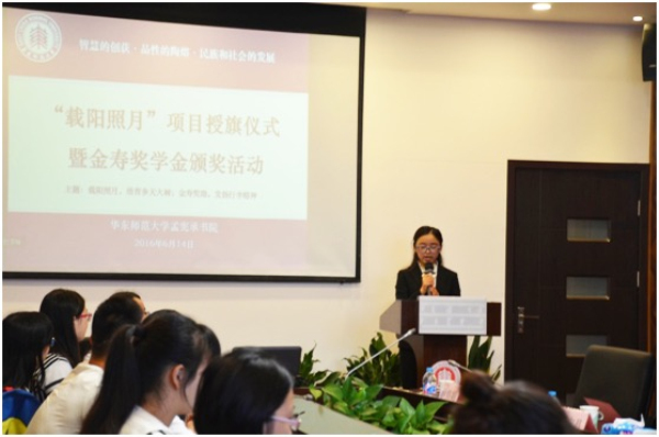 六月,骄阳似火,暑气留恋。但这风风火火却远不能掩盖“载阳照月”项目组的各个同学在出战之前的澎湃之情以及金寿奖学金获奖同学们满满的感激之情。怀着这样一份激动,这样一份感恩,孟宪承书院“载阳照月”各个项目组同学与金寿奖学金获奖者们于2016年6月14日18:00在学生共享空间303室举办了“载阳照月”项目授旗仪式暨金寿奖学金颁奖活动。