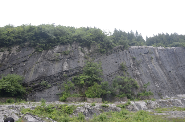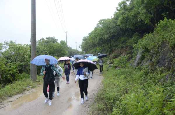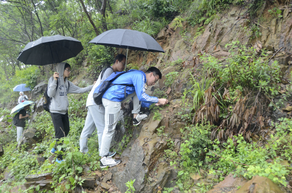 到了没多久,雨渐渐的大了起来。老师和同学都打着伞继续实习考察。老师为我们讲解到,这里是海相沉积环境所形成的地形,让同学们观察其地层的新老关系,并测量它的产状等。同学们就纷纷积极主动地参与其中,打着伞测量产状以及思考为什么这里的产状相比于前两天测量的结果不同,探究其原因。