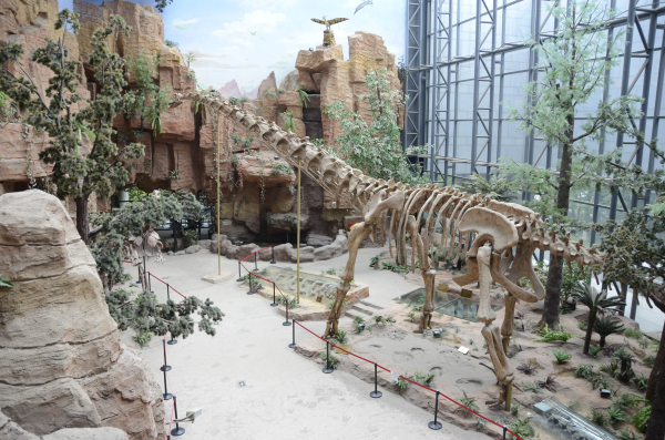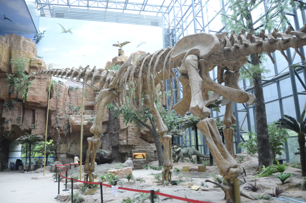 模拟中生代场景的巨大展示空间,陈列有世界上保存最完整、亚洲最大的恐龙——炳灵大夏巨龙。同时展出;首次装架展出了杨钟健先生在国内首次发现的3具恐龙真骨化石;还配有恐龙影院、模型互动、恐龙常识介绍与知识查询展区。