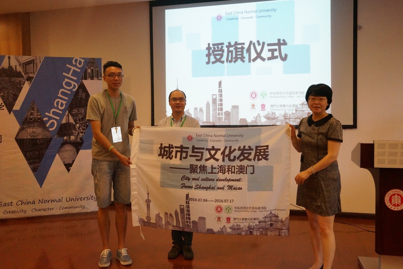 上午8:30,开营仪式在华东师范大学学生共享空间202正式举行。华东师范大学孟宪承书院党委书记兼院长吴薇教授致辞,对澳门大学曹光彪书院的师生致以热烈的欢迎和诚挚的问候,更表示期待曹光彪书院的项目成员能够在领略上海和师大文化魅力的同时,了解双方书院间的渊源背景,为今后双方的进一步合作打下坚实的基础。在致辞结束后,吴薇书记向孟宪承书院及曹光彪书院两位领队代表授旗,宣布暑期互访交流项目(上海站)正式开始。