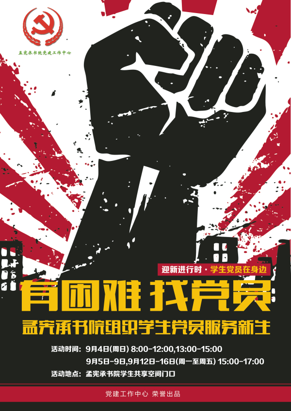 今年的开学季,依然是那么青春洋溢,热闹非凡,学生党员也已做好了准备,奋斗在迎新前线。有困难,找党员,学生党员们一定会尽自己最大的努力帮助你解决学习、生活中遇到的困难,让你尽快适应大学生活。他们来自孟宪承书院各个专业,为了共同的目标聚集在一起。孟宪承书院党建工作中心将继续组织学生党员以文明的举止、热情的指引服务广大新生、展示党员的风采,切实履行党员义务,践行服务宗旨,充分发挥党员在服务奉献中的先锋模范作用。