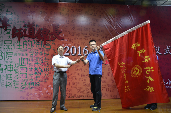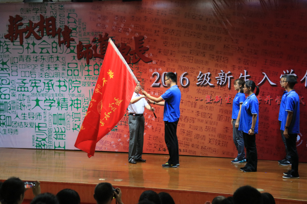 书院名誉院长王建磐教授向2016级新生代表授旗,欢迎他们为孟院注入新的血液,未来的道路漫漫,理想之灯不灭!铮铮誓言震撼人心,殷殷期盼铭刻内心,新一批孟院人将用勤奋谱写出动人的诗篇,用执着描绘出壮丽的彩虹。