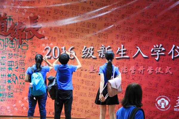入学仪式的背景板上排列着书院2016级共359名新生和辅导员的名字