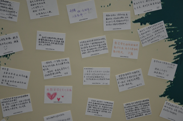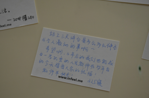 正值教师节,同学们都带来了写着自己对未来教师生活的美好寄语。一张张明信片,一条条留言,便是这一群学子们炽烈心情的最好体现。她们心存梦想,她们满怀希望,透过那一双双坚毅的眼睛,我们仿佛已经可以想象到她们站在三尺讲台上的身影,坚决果敢。