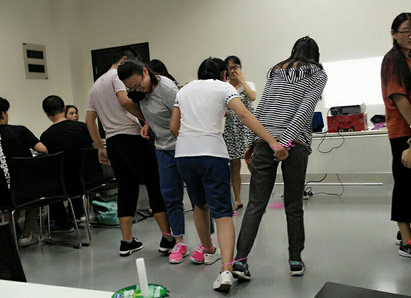 严肃话题结束,又到了游戏时间啦!这一轮的游戏叫做——合作无间。由每个部门的成员来合作完成。每个部门派四位小盆友排列成一排,相邻两人向相反方向站立。将手两两捆住,最后留下末端两只左手来完成指定任务。