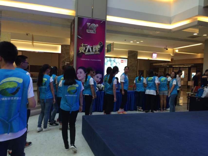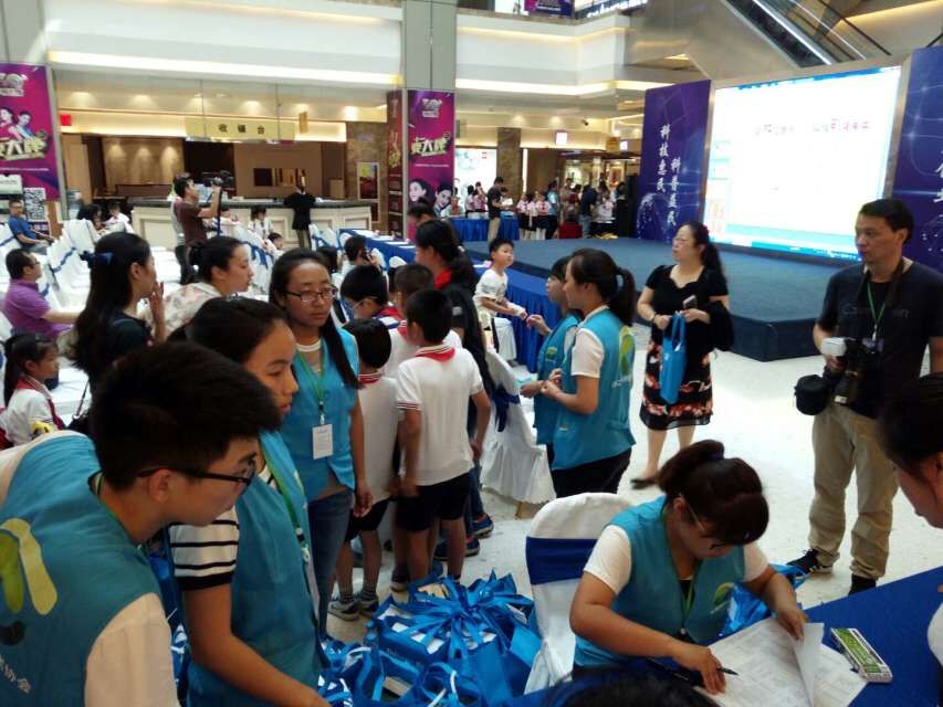 在上午场活动时,我们的志愿者主要协助主办方维护现场秩序,进行签到工作,分发科技活动体验券,引导家长和孩子入座并分发奖品,给家长和孩子们提供了贴心的服务。
