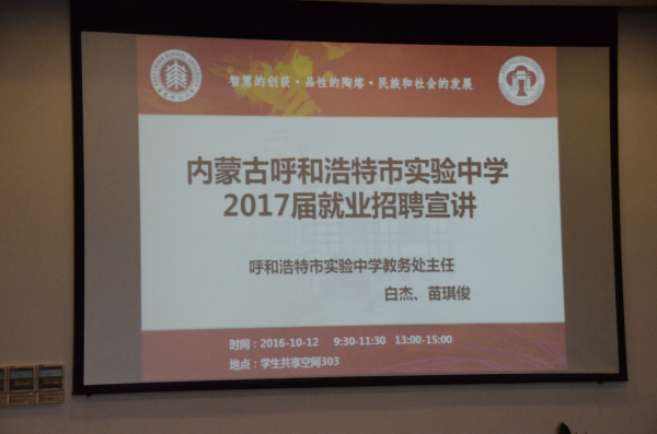 2016届就业季进入尾声,2017届就业招聘已然到来。2016年10月12日,内蒙古呼和浩特实验中学教务处主任白杰、苗琪俊来访,面向2013级、2014级免费师范生进行就业宣讲。孟宪承书院副院长苏振兴、就业推进办公室主任益建芳进行了接待,参与本次宣讲会的还有孟宪承书院团委书记温旭及学工组长刘佳。
