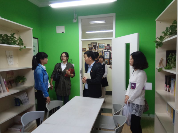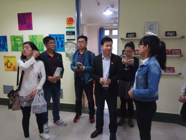 继续往前走,里面更是别有洞天。教师技能中心、公益中心、社团发展中心等各个中心的办公室一一呈现,每一间都极富创意,将各中心的特点展现地淋漓尽致,以致于南洋书院的师生都忍不住拿出手机拍下这一间间由学生自主设计完成的办公室。同时,南洋书院的张超才老师也不禁感慨道:“我真的很讶异贵校能够把一间间办公室都设计得如此精美,让人有想待在这里的冲动。而我们学校是理工科学校,男生占的比重相对较大,而男生本没有女生那么细致,因此在这一方面的确欠缺不少。”此话一出,逗乐了不少同学,而南洋书院的3名男生也表示会在今后有所改善