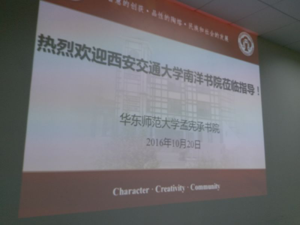 2016年10月20日,下午1时许,西安交通大学南洋书院的团工委书记张超才老师带领了七人学习访问团共赴我校华东师范大学孟宪承书院交流学习。此次活动由孟宪承书院的陆云鹏老师、沙炜娟老师和孟宪承书院团学联十大中心的4名成员共同参与接待来访师生,希望借此机会能够助南洋书院的师生更了解孟宪承书院的办学理念、学生培养模式及学生事务管理方面的工作,并在交流中增进两院党团组织的感情,为今后两院进一步的交流合作打下一个良好的基础