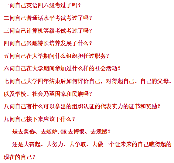然后沙老师给我们简单的介绍了就业推荐表的内容,为了避免15级的同学们在两年后重蹈覆辙,沙老师让同学们问问自己这几个个问题: