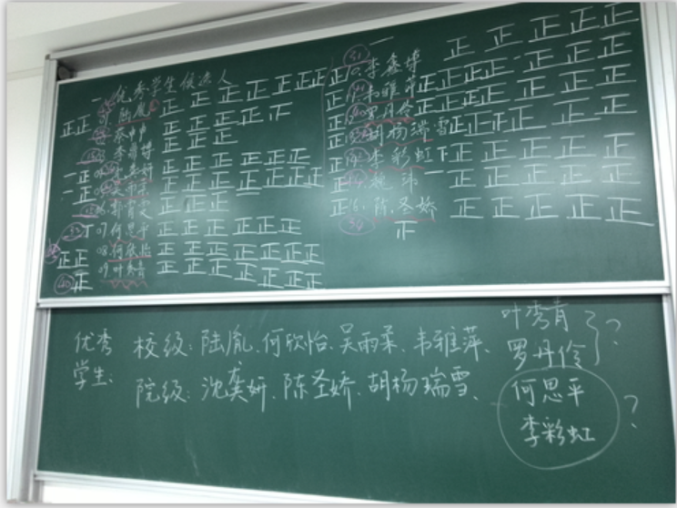 被大家选出来的优秀学生干部和优秀学生都是14级中文师范班的模范,票数并不重要,重要的是,从这些同学们的身上,我们懂得了"优秀"的含义,优秀的定义不仅仅是成绩,更是为人的态度,人生的精彩。希望优秀学生和优秀干部将一直努力下去,并带动整个集体,展明日风姿。