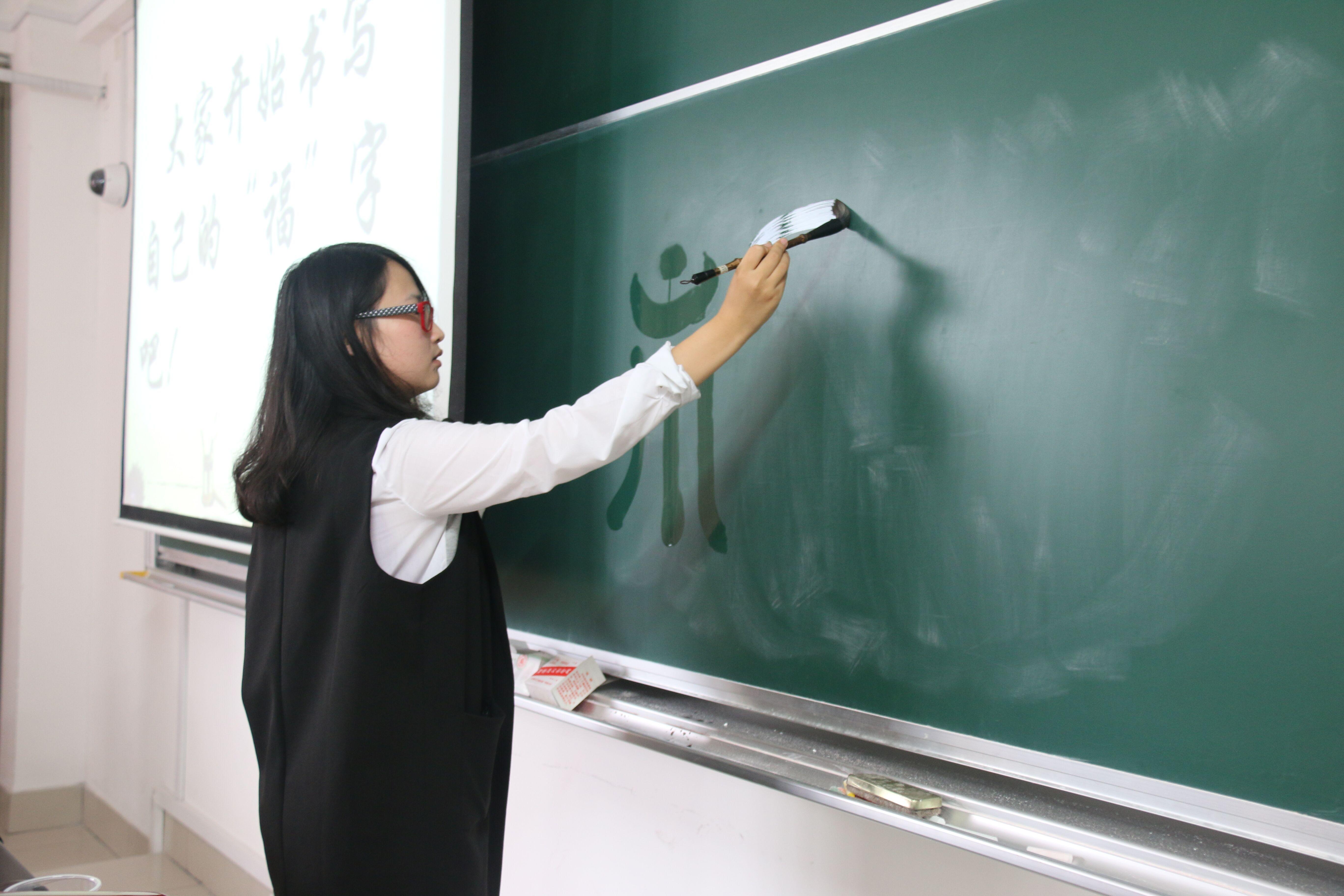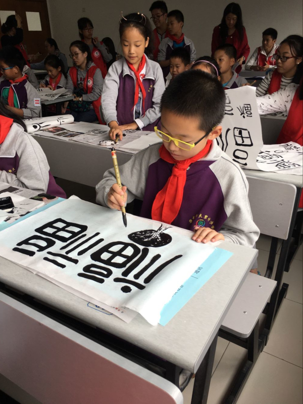 课堂以走近中华传统文化、学习书法开始,由书法社志愿者向小朋友们介绍书法必备之“文房四宝”,展示了笔墨纸砚的分类、功用。让了解或是不了解书法的同学都有了一个详细的认识。为了进一步品绎中华文化,小朋友们拿起了毛笔,在志愿者们的指导下亲自挥毫,写下了“福”字,写出美好祝愿,体验书法之美。