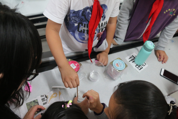 短暂的放松过后,到了小朋友们的动手时间。公益中心特地邀请了O3协会会员,向小朋友们讲解并教授制作滴胶标本的过程。看着志愿者们分发的形状各异的模具和种类繁多的花草,小朋友们来了兴致,纷纷积极地动起手来,调制胶水,小心翼翼地倒入模具,制作标本。