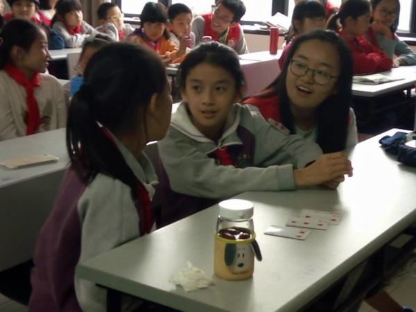 体验完中国文化,活动进入了第二个科目,英语趣味猜单词。小朋友们分为了六组,开始限时比赛。通过你比我猜、互相协作的方式进行游戏。看着小朋友们奋力笔画,蹦蹦跳跳的样子,志愿者们也乐在其中。游戏结束,获胜小组抱着自己的奖品笑的十分灿烂。