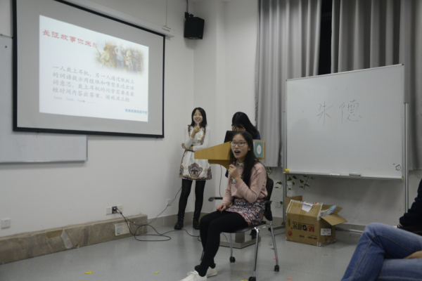 长征版本的“你来比划我来猜”更是玩出新花样,让同学们在欢乐中重温长征过程中的经典战役与精神领袖。经典战役“四渡赤水”、“飞夺泸定桥”,著名长征将帅“朱德”、爬草地过雪山的“红军”,同学们八仙过海,各显神通,为了表现出各个词语的特征而拼尽全力。尤其是英语专业的施宇杰同学,他生动形象的表演令所有人印象深刻!