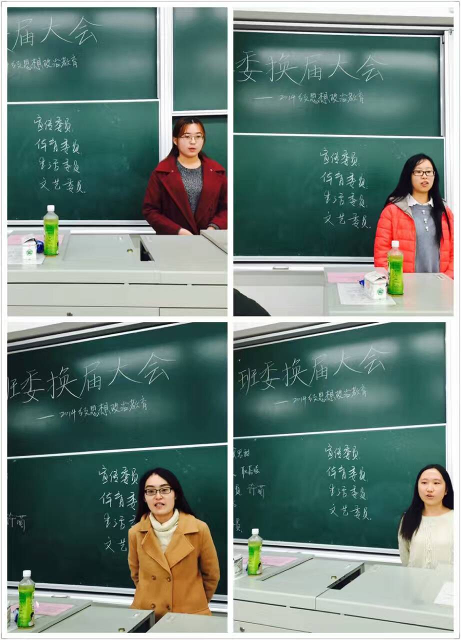 春有百花秋有月,夏有凉风冬有雪。四季总在无声地悄悄变换着,当我们还沉浸在秋日的凉爽惬意时,殊不知寒冬的冷风已然悄悄爬上了枝头。就在这样一个季节更替之际,我们14思想政治教育专业也在2016年11月25日这一天于第一教学楼219迎来了第三届的班委换届选举。出席此次选举大会的成员有14思想政治教育专业的辅导员——刘佳老师以及14思政专业的全体人员。