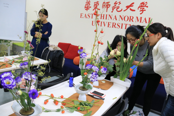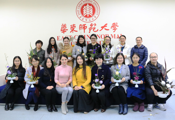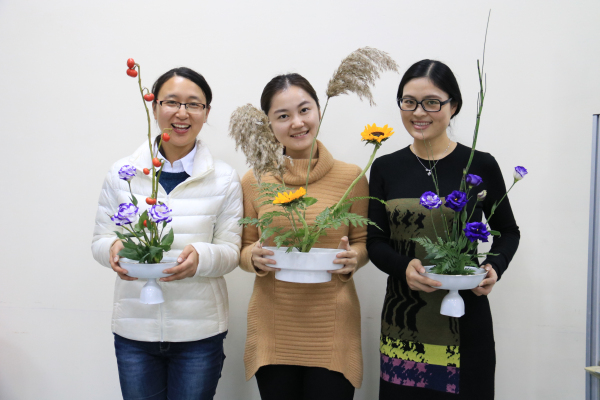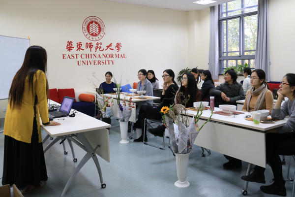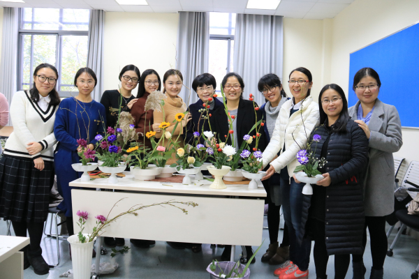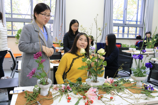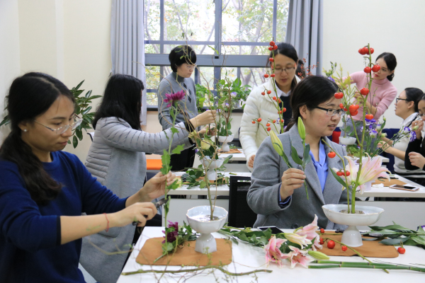 此次活动邀请了专业花艺师游巧芳老师担任主讲,她首先向老师们简要介绍了插花艺术的起源和主要艺术流派,并以“小原流花艺”为例,阐述了插花“静、雅、美、真、和”的寓意,以及“悦己”与“悦人”的异同,一下子提升了大家对于花艺的理解。接下来她现场演示了插花的基本技术手法和花材的排列组合,原本单调的花材,在花艺师手下不经意间就变成了赏心悦目的插花作品,引来老师们的啧啧赞叹,大家都跃跃欲试,迫不及待地想亲身实践一番。
