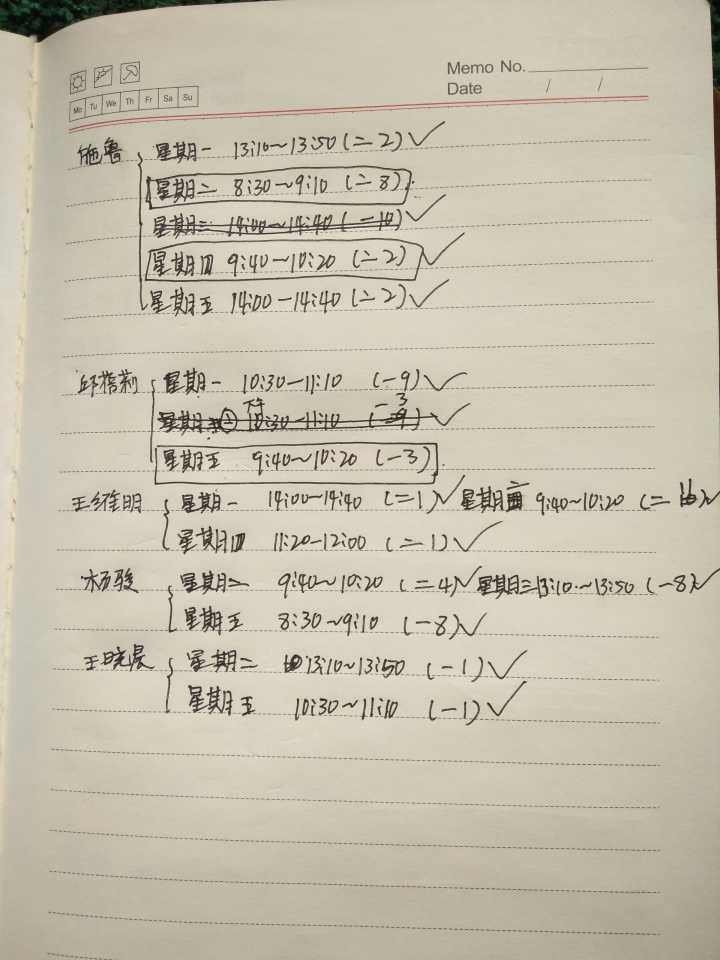 我们见到了我们的指导老师,施鲁老师,老师对我们很是照顾,认真交代我们应该完成的任务,按照地理组的课表,再根据老师们的建议和我们自己的意愿我们也制订了自己的课表,除了任务老师还很关心我们,帮我们联系了财务部,为了让我们在实习期间吃好,老师特意安排我们办了饭卡。