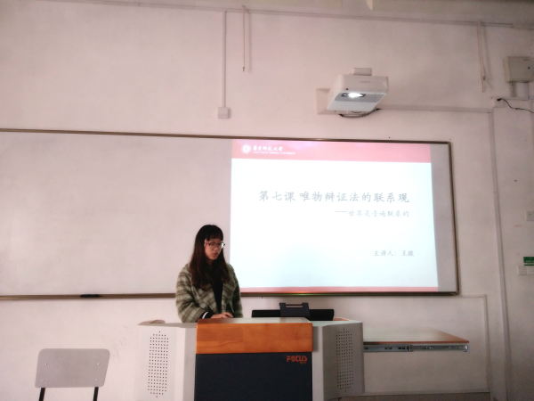 王燚同学则带来的是哲学生活中《唯物辩证法的联系观》的内容,授课之初王老师带着同学们回顾了单元架构和上一课的内容,以提问的方式将同学们带入教学环境。简介大方的PPT和生活中的小实例,枯燥的哲学内容也变得生动有趣起来。