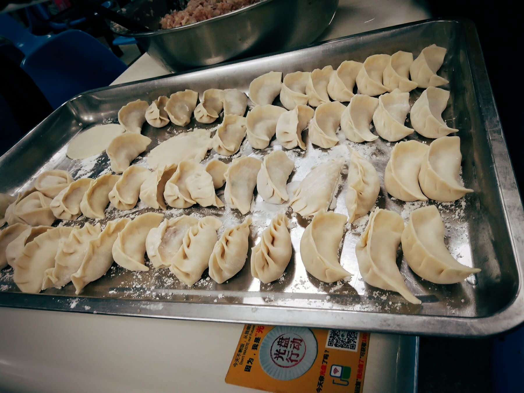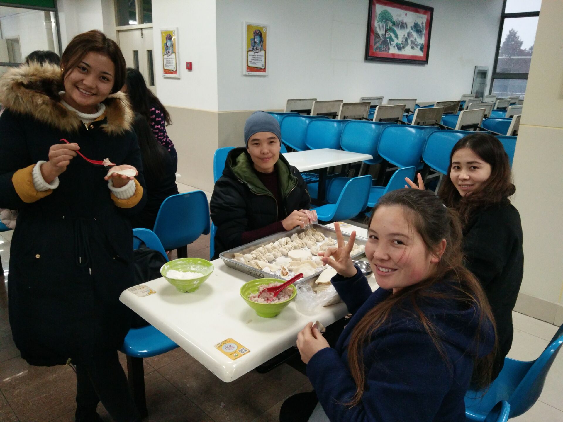 食堂师傅端来饺子馅和饺子皮后,来自五湖四海的同学们纷纷大展身手。有人会有点羞怯,觉得自己包的饺子不好看,积极的学习别人的包法;有人呢则是心灵手巧,包出的饺子一看就让人垂涎三尺。女生一边说笑一边干活,男生也不甘落后,一个使劲摁扁了包好的一个饺子,惹来大家一片笑声。