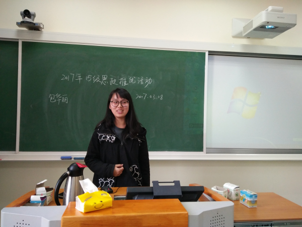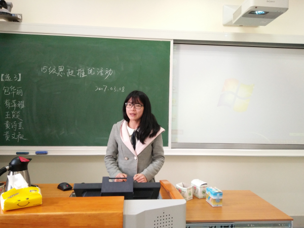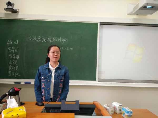 3月8日下午两点半,15级思政专业齐聚共享空间216,参加推优活动。首先各位参选同学上台介绍自己,简要回顾自己在过去的一学期中学习的收获,为班级所做的贡献等,竞选过程在轻松愉快的过程中开展。