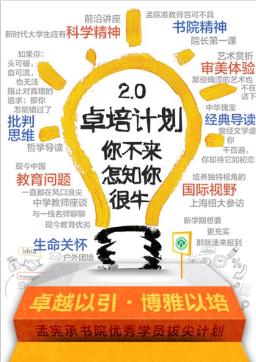如果每个周日的早间一群书院生八点准时前往自由研讨室开启一天的课程学习,你是不是会觉得很奇怪?如果一个学习班级的学生来自于12个不同的专业,但是可以和谐、高效的开展一系列课程的学习,你是不是觉得会不可思议?如果一门课程的主讲教师的来源总是在文人社科、自然科学、艺术审美等不同领域自由切换,你是不是觉得难以理解?所有的新奇、不可思议、难以理解,其实在孟宪承书院的卓培计划你都可以找到答案,让我们一起走进“卓培计划”2.0。