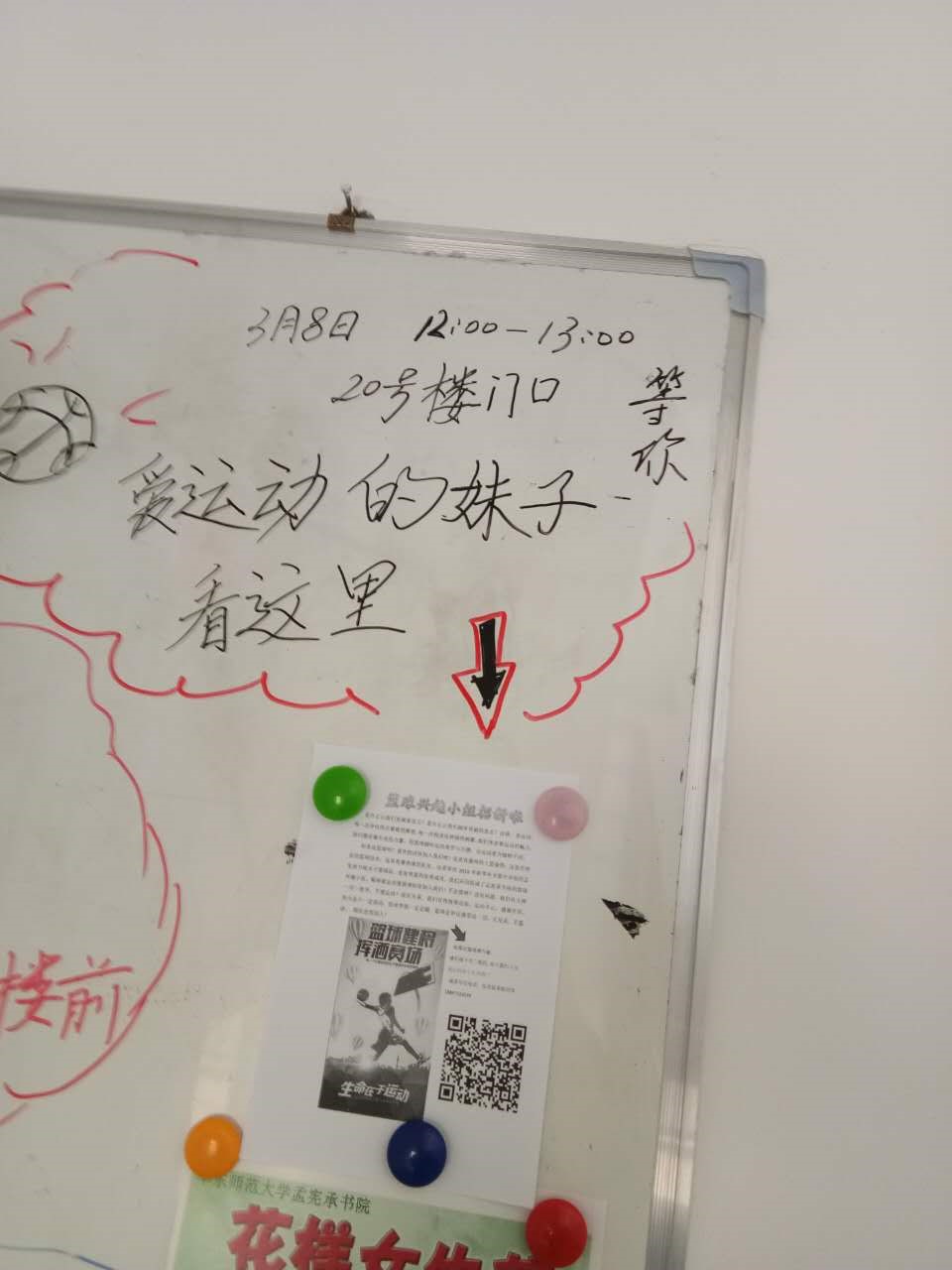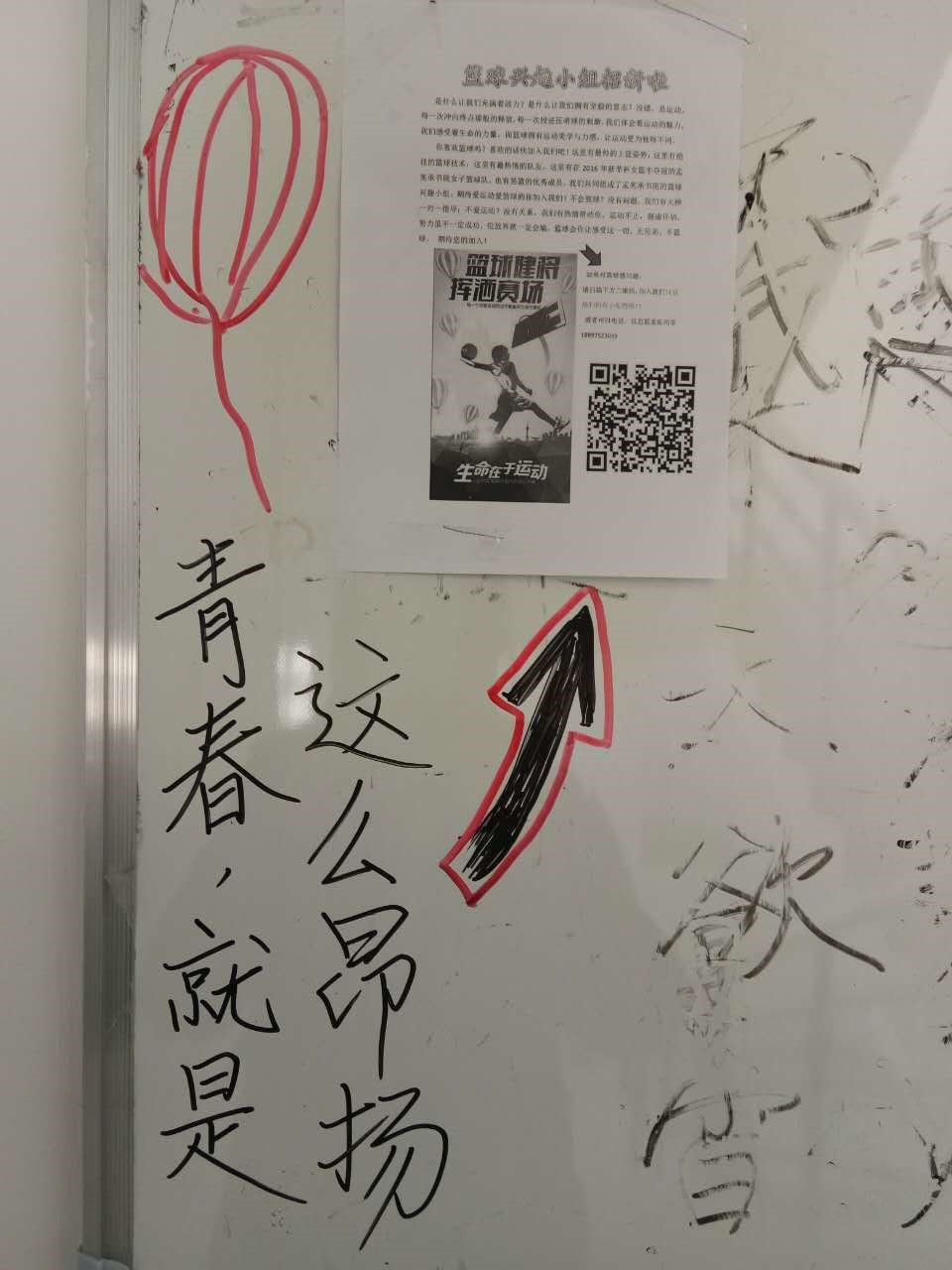 经过一番精心准备,篮球兴趣小组的招新活动即将开始,为了加大招新力度,我们还在前一天晚上提前地宣传——在20、22号楼的每层楼的公告栏上张贴宣传单,并且在一楼楼道里放置海报,以吸引更多的对篮球感兴趣的小伙伴。