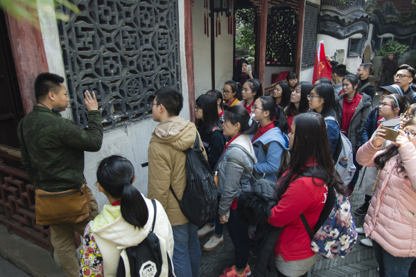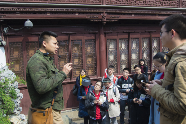 “对人类影响最大的就是空间,空间是一个综合体。建筑呈现的是一个人文环境,这个环境对人的影响最深刻。”置身春日的豫园,陈东杰老师从代表性的中国传统建筑谈起,从闽派的土楼、晋陕的大院、徽派民居引至江南园林,唤起大家对中国各地建筑的差异化的直观感受,随之引据《园冶》、《浮生六记》、《美学散步》,点出江南园林独有的魅力和风韵:怡情遣性。