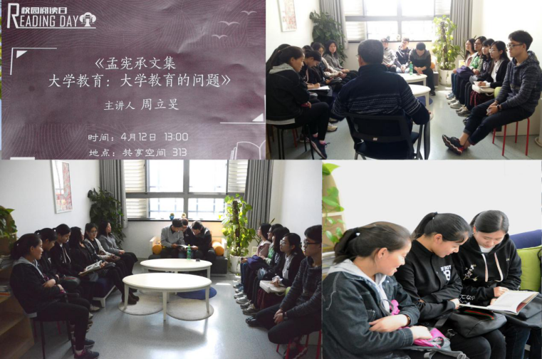 4月12日下午1点,地理科学2016级全班同学聚集在共享空间313举行了“我和人生导师一起读”校园主题日活动,辅导员益建芳老师以兼职人生导师的身份和我们一起阅读了孟宪承文集的第一章“现代大学的理想和组织”。在益老师声情并茂的朗读后,我们了解了孟宪承老校长的先进教育理念,内心感到十分钦佩和敬重,继承发扬我校优秀的教育精神。