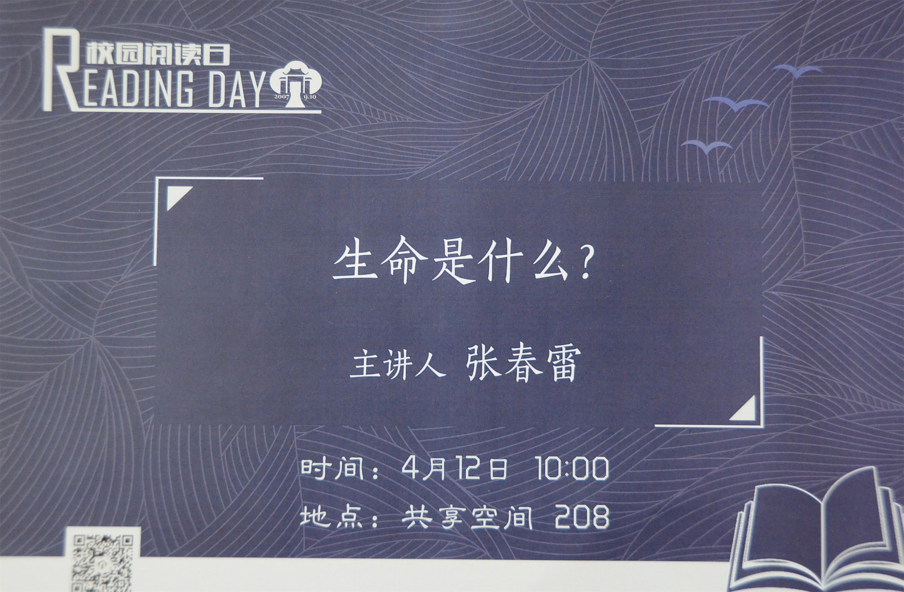 在4月13日下午一点这个阳光明媚的日子里,14级生物科学全体学生在主讲人张春雷老师的带领下跟随学校读书日的步伐在共享空间312举行了“生命是什么?”主题的读书活动。
