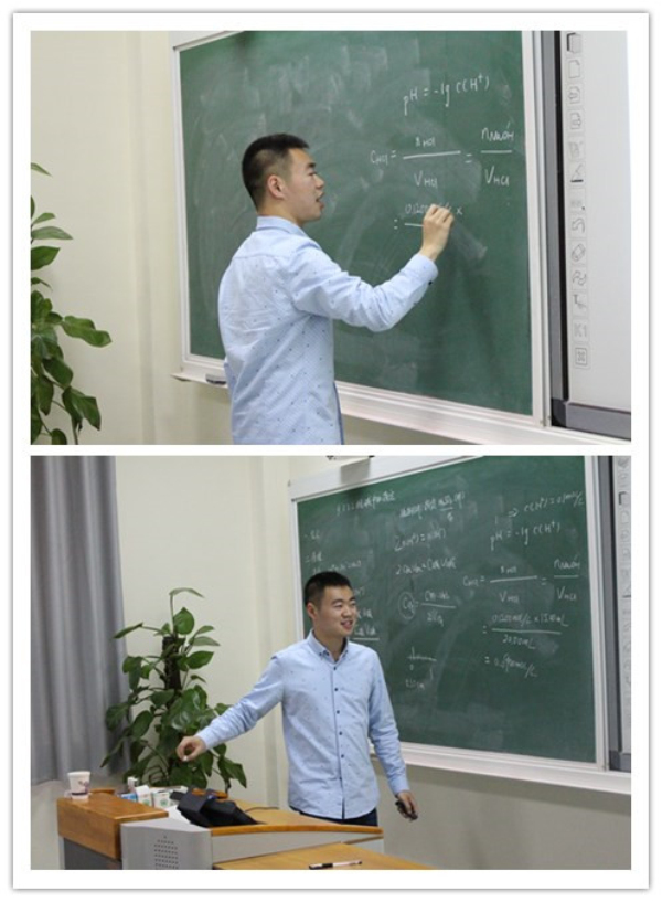 生物&化学专场中,首先为我们讲解的是化学专业刘雨松学长,讲授的课程主题为酸碱中和滴定实验。课程开场,他先对于需要探究的问题进行切入引导,通过与观众的互动与问答,巧妙地吸引了观众的注意力。课堂上时而风趣的语言,使原本拘谨的气氛活跃起来,一来二去引得同学们哄堂大笑。妙趣横生的谈吐使原本枯燥、难以理解的科学性语言变得轻松有趣,在围绕主题的同时引起了大家求知的兴趣。