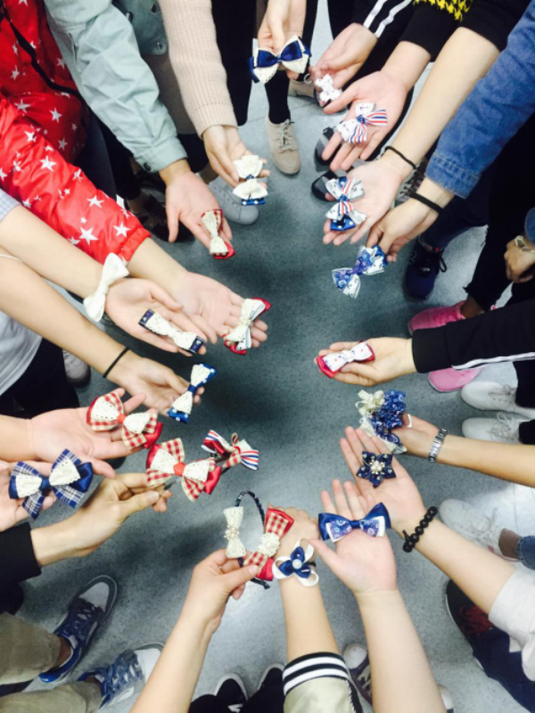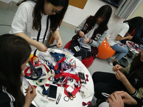 一个小时过后,同学们作品基本完成。大家嬉闹着将自己的头花给其他同学戴在头上,并合影留念。之后,主持人对此次活动作出简短的总结,让同学们谈谈自己对公益的看法和