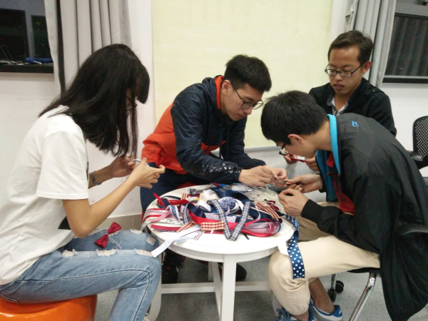 活动开始,主持人先组织大家观看学习制作头花的视频教程,在介绍完活动内容后,同学们热情高涨,自由组合分为四组,拿着制作材料开始了自己的发挥创造。在制作过程中,同学们互相配合,发挥想象力制作出了属于自己的作品。各组间也相互学习,分享自己的心得,气氛十分活跃,笑声阵阵。