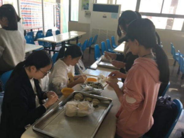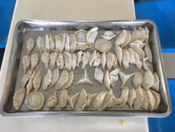 早上十点,在简单介绍过清明节的传统习俗后,就是同学们所期待的包饺子环节。同学们来自五湖四海,各个地方的饺子的包法有着不小的差异,在一个盘子中几乎找不到长的一模一样的饺子。此外,有的同学手法娴熟,有的同学可能刚刚接触,并不会包饺子,就这样,同学们互相请教学习着,尝试着包出各种形状的饺子,气氛十分热闹。。同学们调配着各自的蘸料,边吃边聊,十分快乐与温馨。